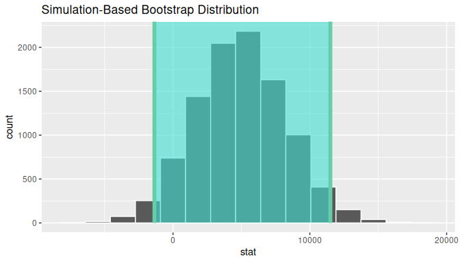 Note: You could also use the null distribution based on randomization with a shift to have its center at \(\bar{x}_{sac} - \bar{x}_{cle} = \$4960.48\) instead of at 0 and calculate its percentiles. The confidence interval produced via this method should be comparable to the one done using bootstrapping above.
