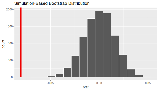 So our \(p\)-value is essentially 0 and we reject the null hypothesis at the 5% level. You can also see this from the histogram above that we are far into the left tail of the null distribution.