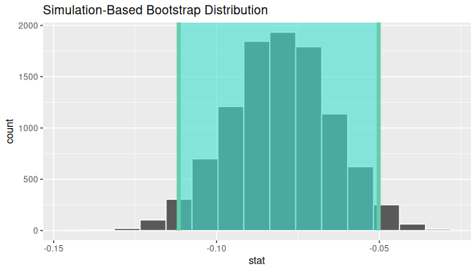 We can also create a confidence interval for the unknown population parameter \(\mu_{sac} - \mu_{cle}\) using our sample data with bootstrapping. Here we will bootstrap each of the samples with replacement instead of shuffling. This is done by setting the type argument in the generate function to “bootstrap”.