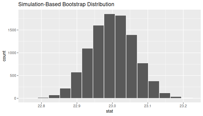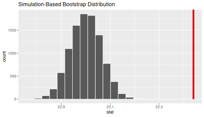 boot_distnobject, and - shift the center of this distribution over to the null value of 23. (This is needed since it will be centered at 23.44 via the process of bootstrapping.)