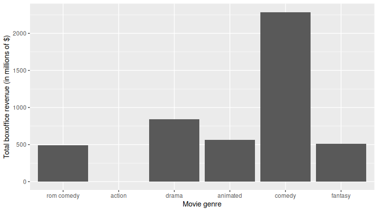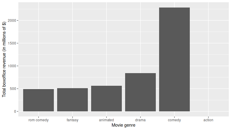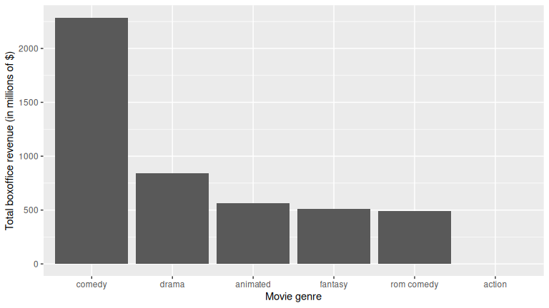 labs(x = "Movie genre", y = "Total boxoffice revenue (in millions of $)")