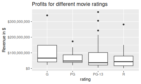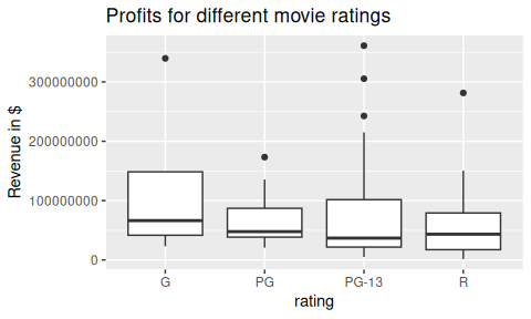 labs(x = "rating", y = "Revenue in $", title = "Profits for different movie ratings")
