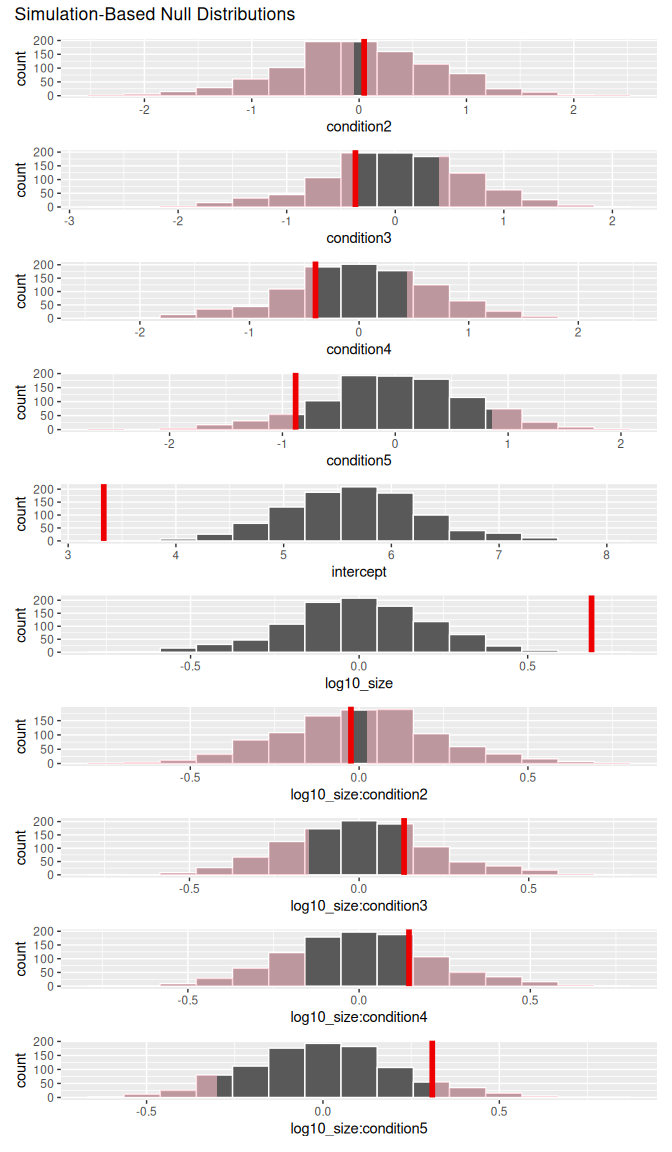 Of the regressors, it appears that only log10_size has a statistically significant relationship with log10_price. This is evidenced by the fact that the observed fit value for log10_size is far outside the range of the null distribution.